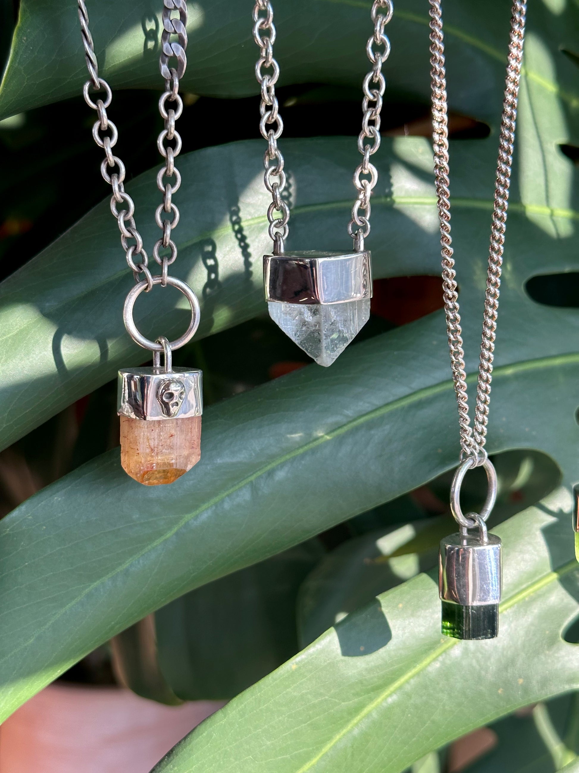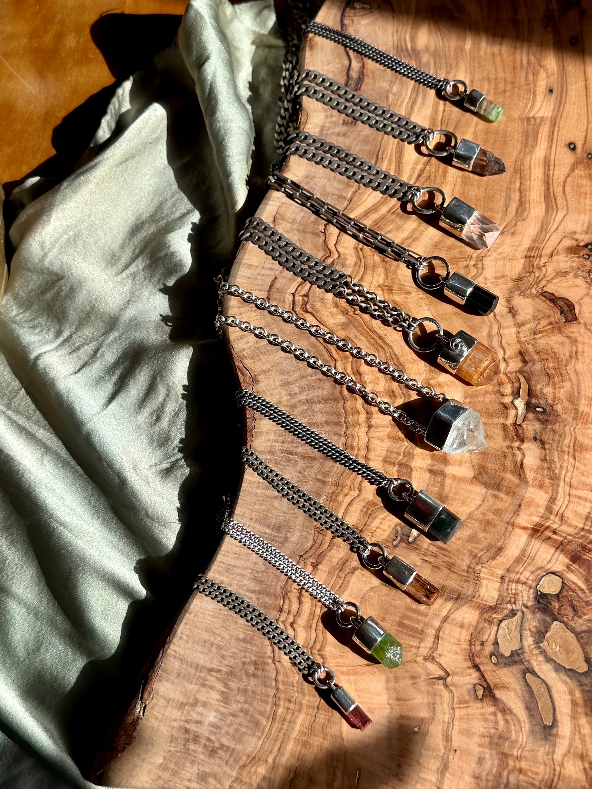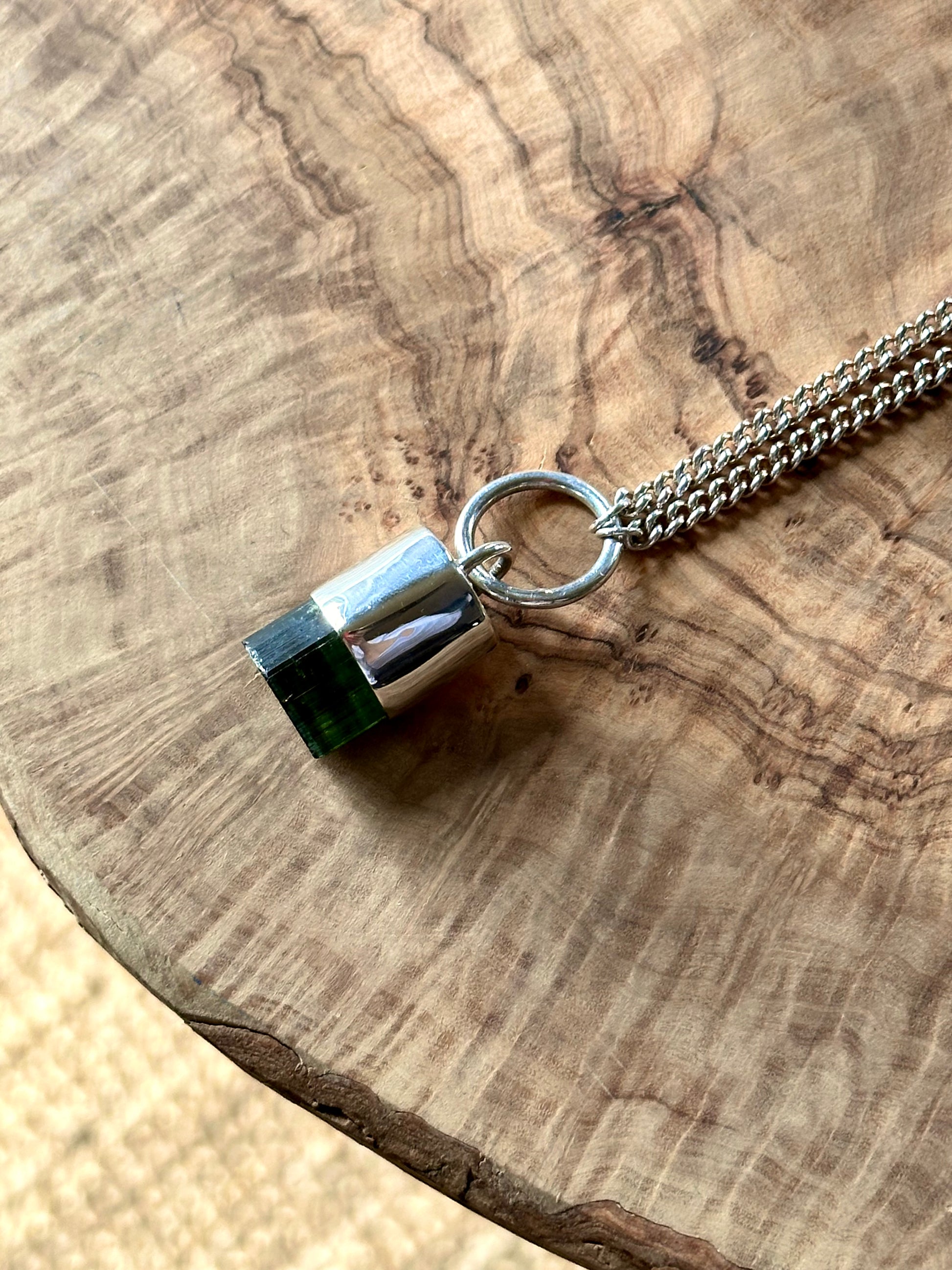 chunky deep green tourmaline pendant with smooth flat termination, set in sterling silver on a sterling silver chain. handmade.
