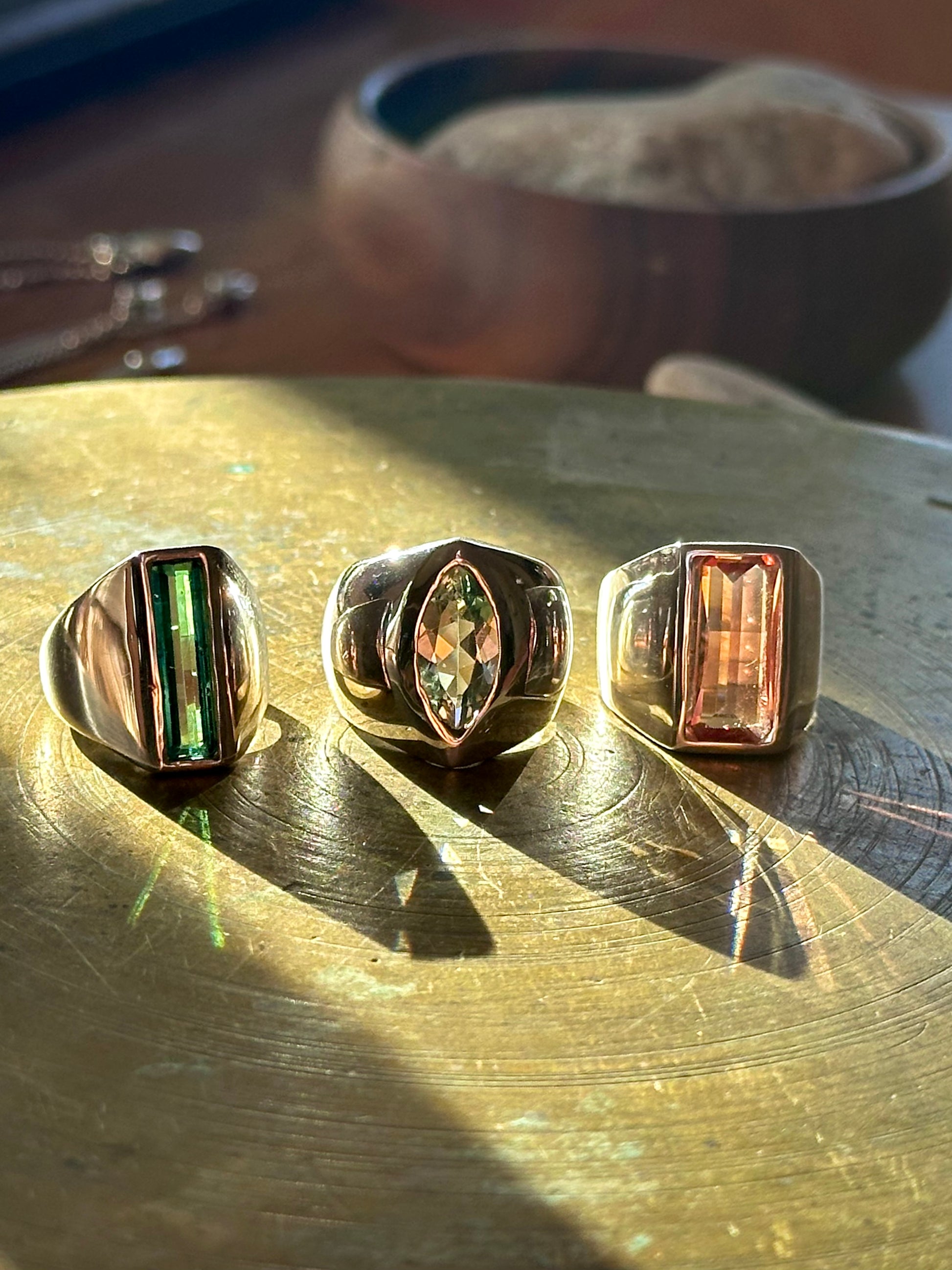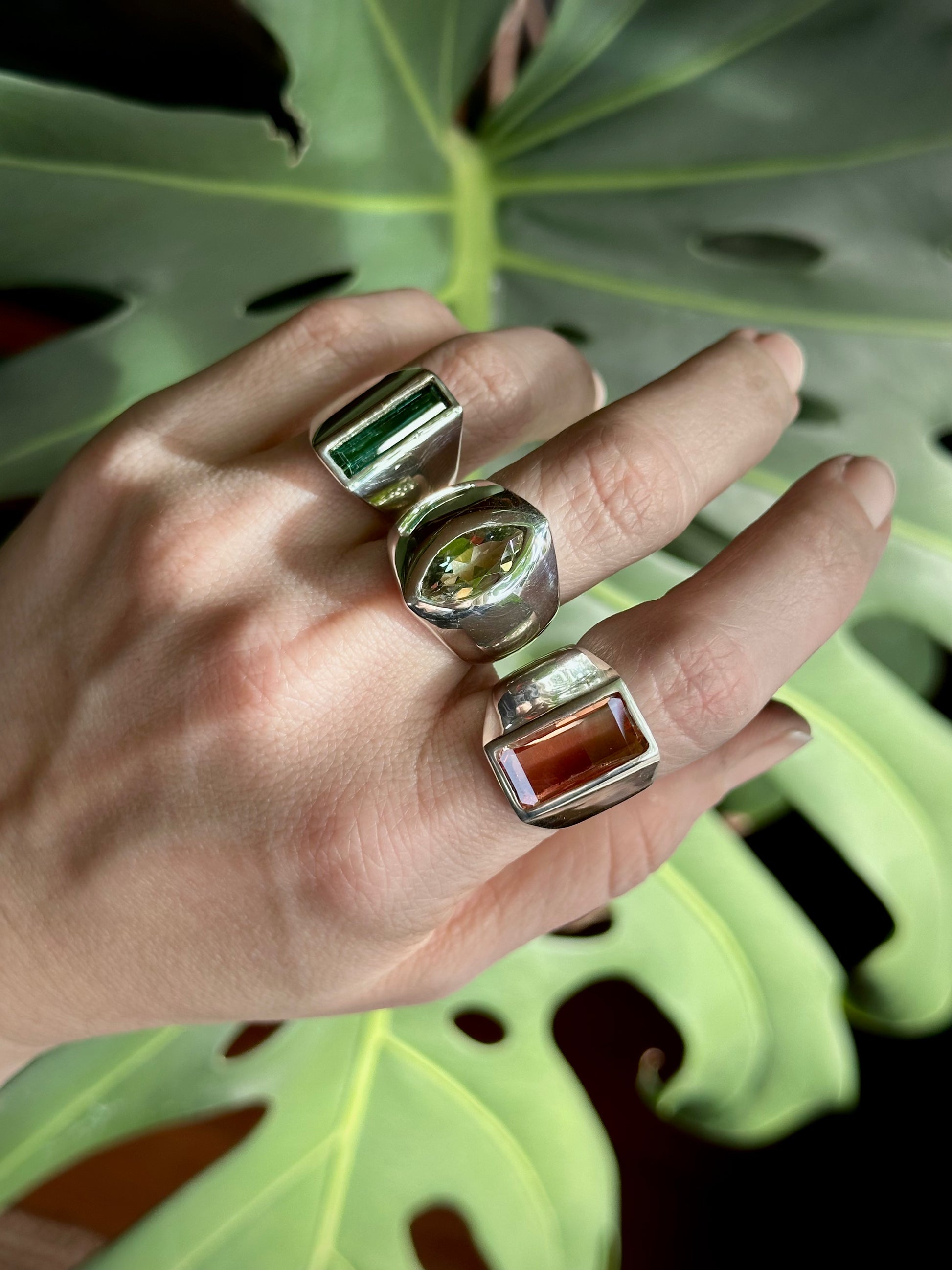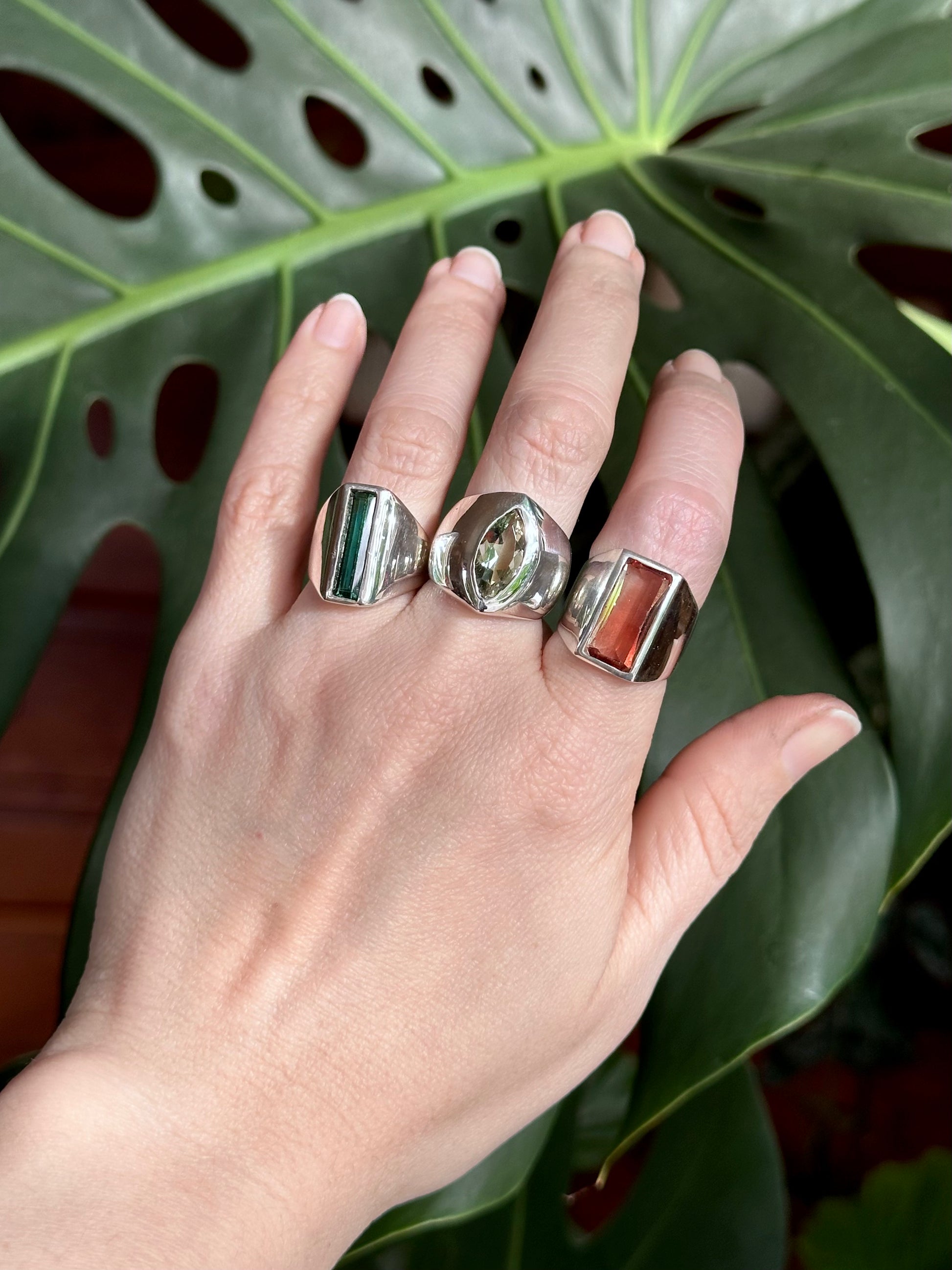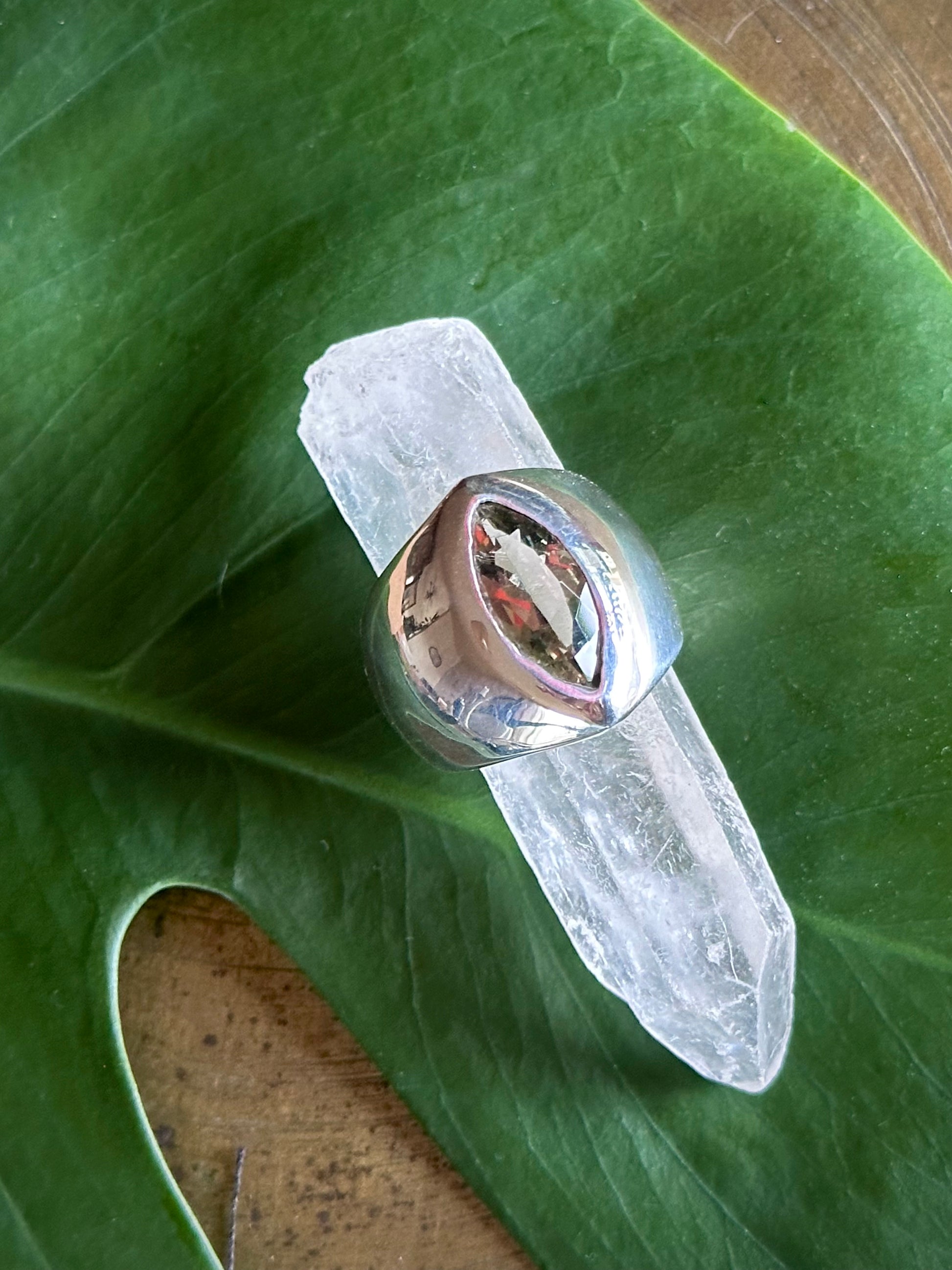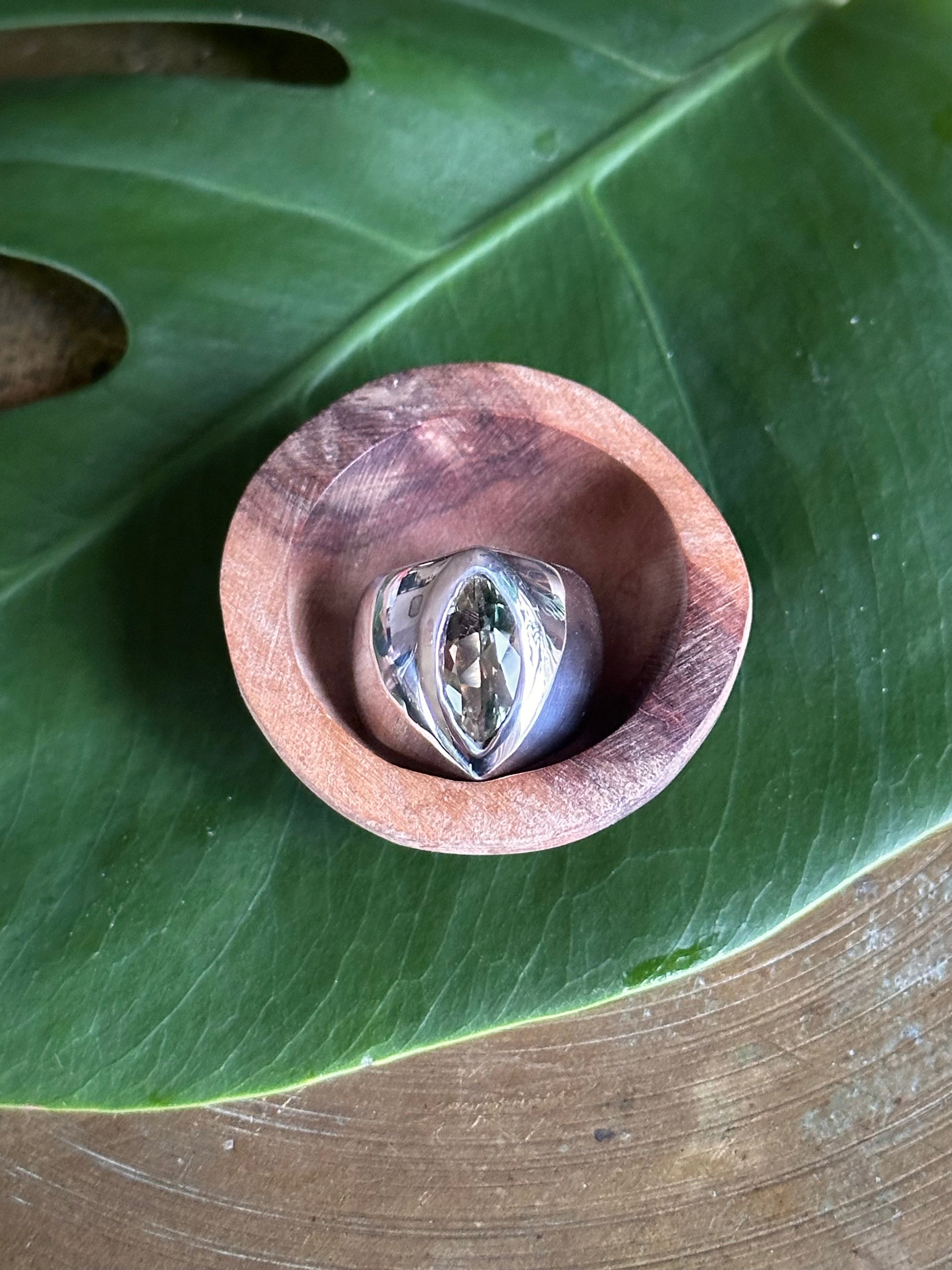 hand-carved and cast sterling silver band with a marquis cut blue-green Oregon sunstone.