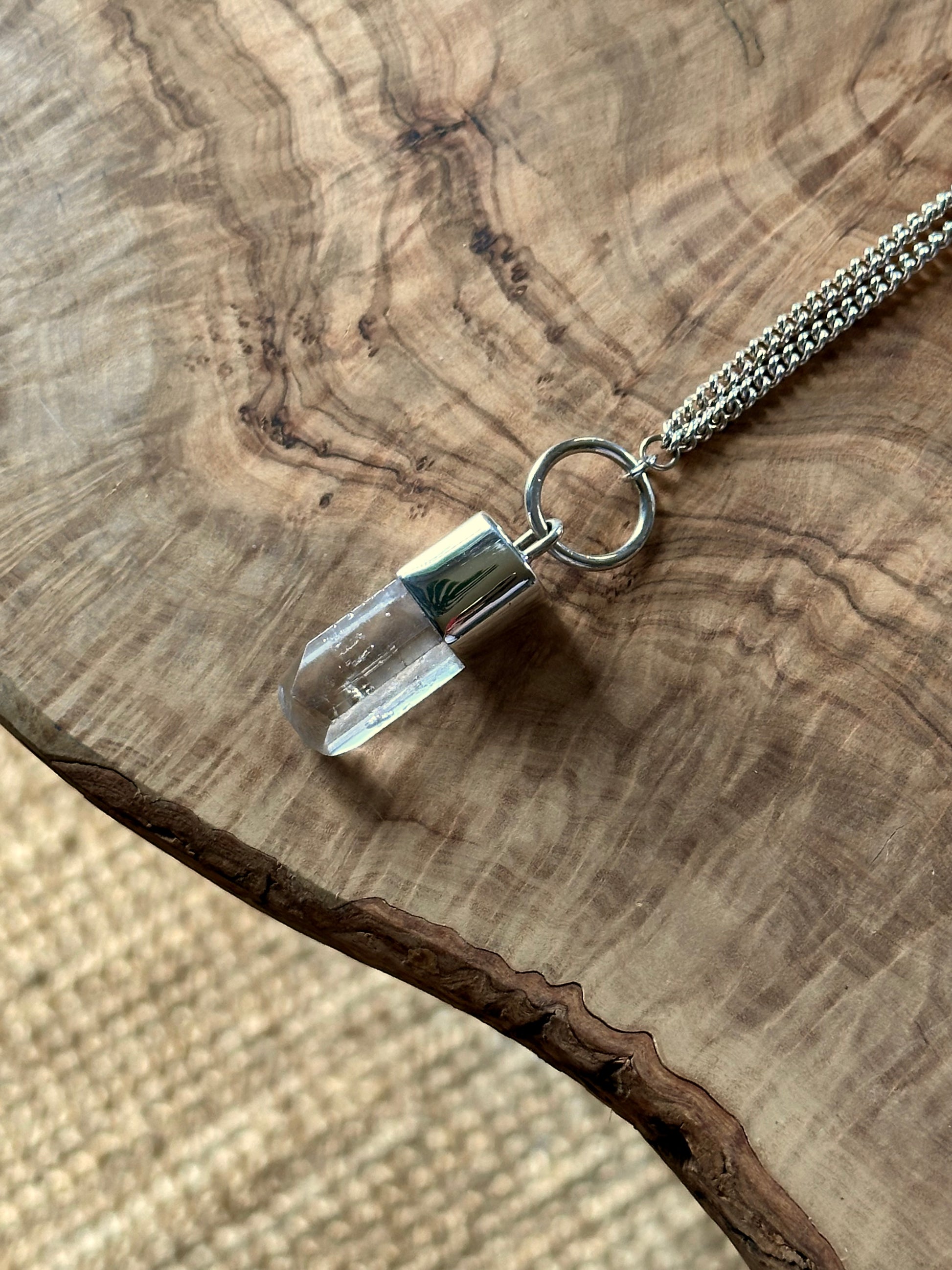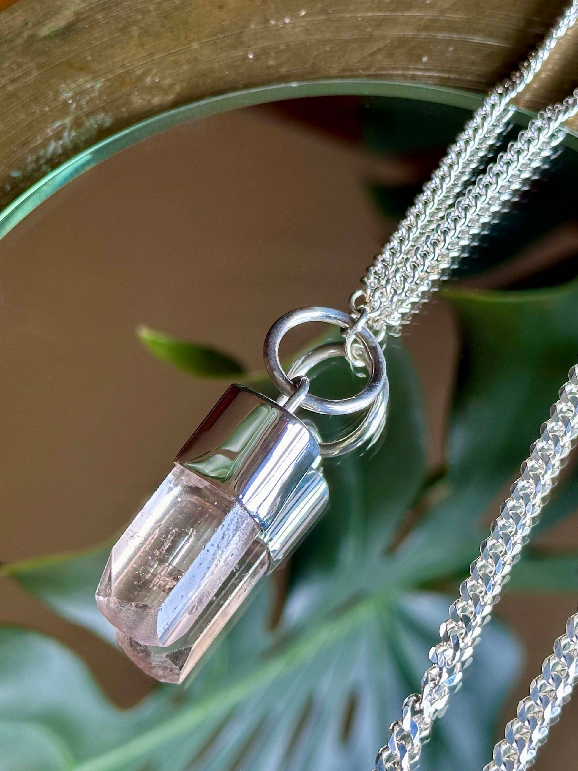 elongated sherry topaz from Katlang, great clarity with interesting etching on the termination, set in sterling silver on a mixed sterling silver chain. handmade.