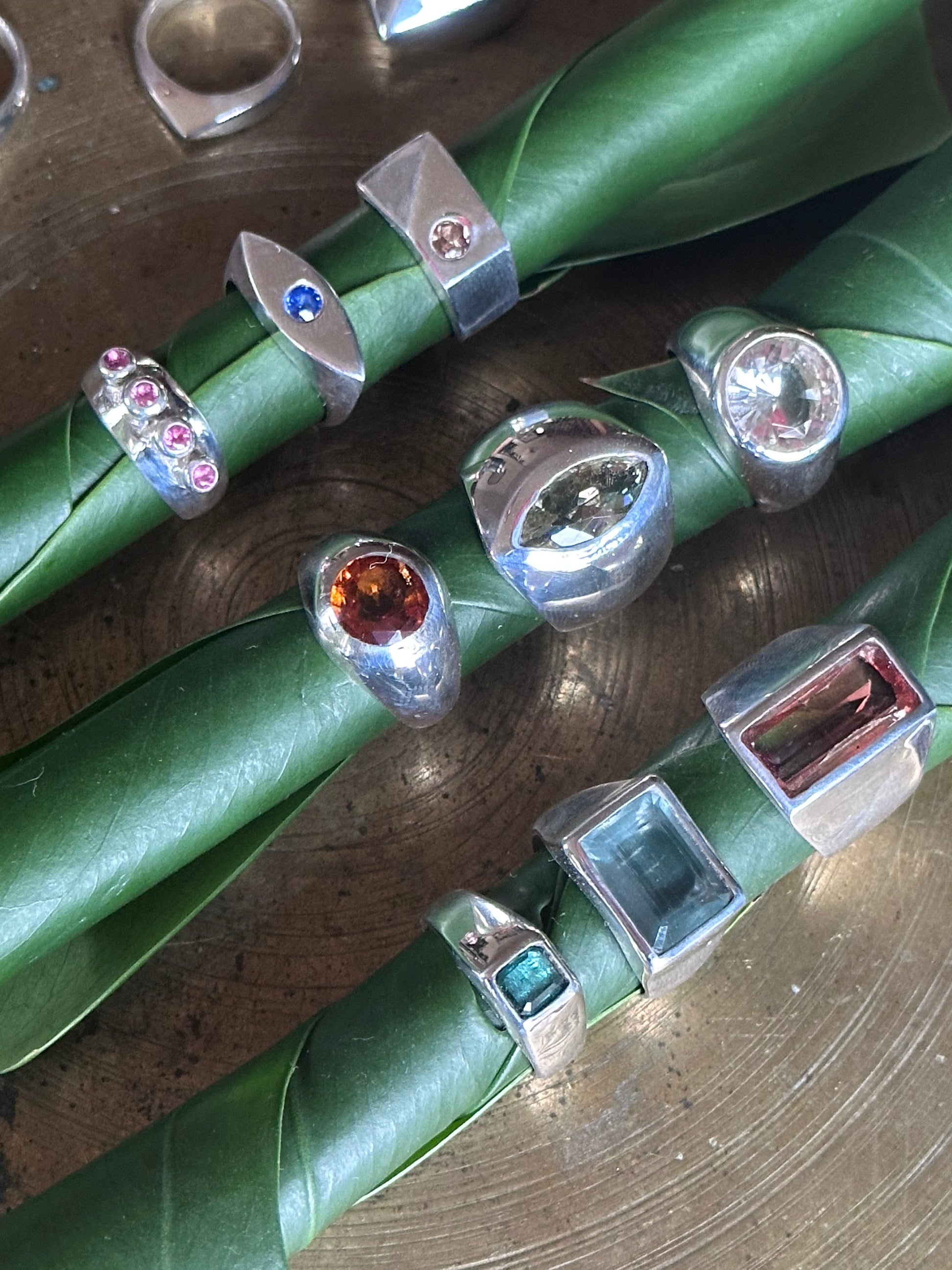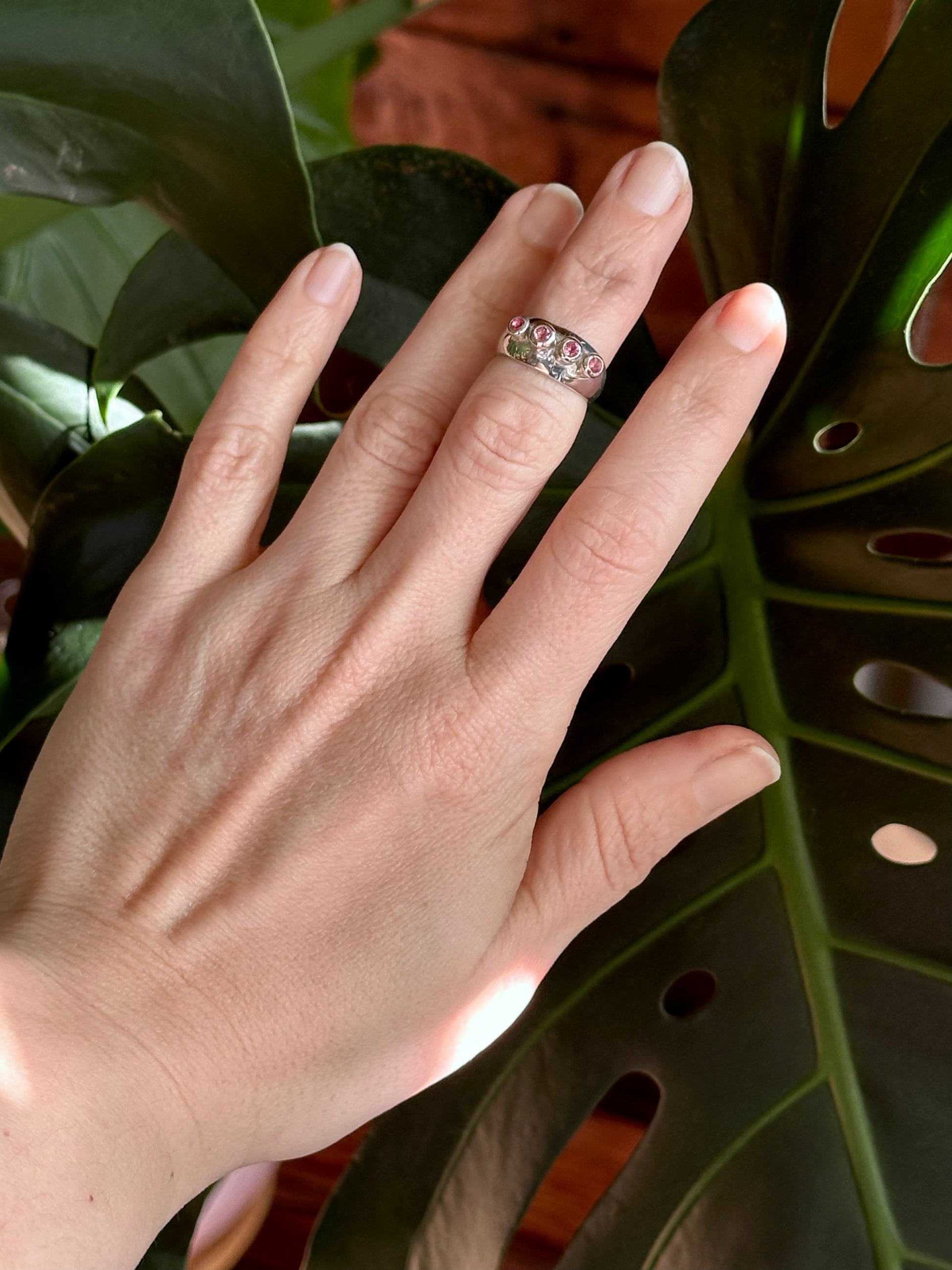 hand-carved and cast sterling silver ring with four pink tourmalines set in raised anemone protrusions. truly unique, kinda weird, pretty fun.